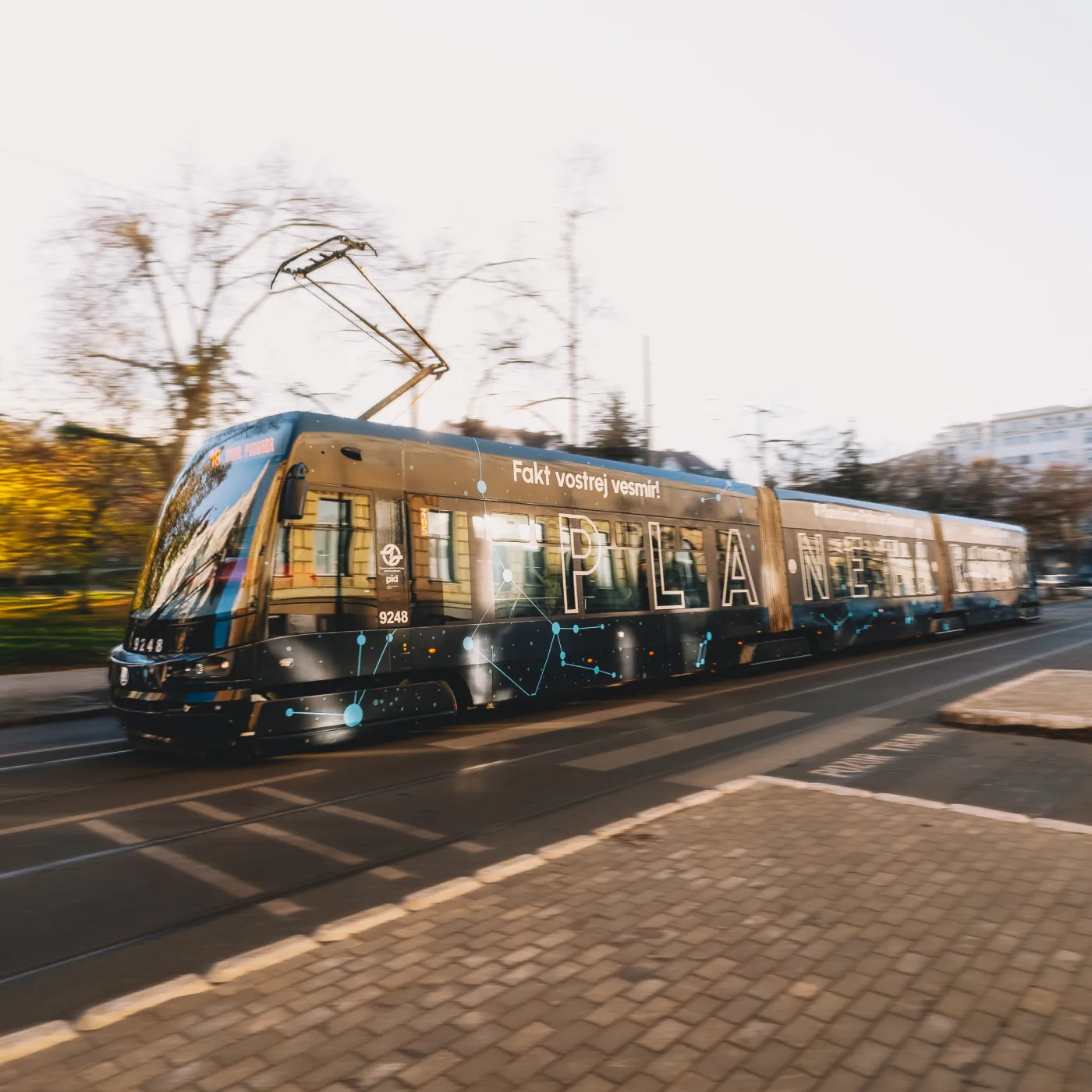 Navrhli jsme taky design polepu tramvaje, která bude od podzimu 2025 jezdit Prahou a propagovat novou LED technologii v Planetáriu.